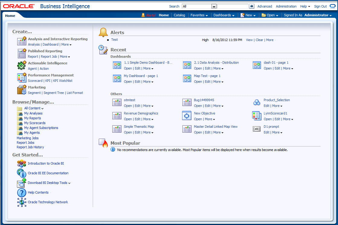 The Home page provides a starting point for performing tasks in Oracle BI EE. The Home page is divided into sections that allow you to quickly begin a specific task, locate an object, or access technical documentation. It also includes sections (for example, Recent and Favorites) that allow you to quickly access objects that you have recently viewed, created, or updated, and objects that are accessed the most often by the users assigned to the groups to which you belong.